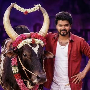 a man standing next to a decorated bull against a dark, purple-hued background. The man appears to be an adult He is wearing traditional South Indian attire consisting of a white dhoti wrapped around his waist and legs, and a red shirt worn open over a white undershirt or vest. The red shirt is unbuttoned at the top, revealing a thin chain or pendant. The man is standing with his weight shifted to his left leg, his right arm resting on the bull’s back, and his left hand placed on his hip. He is looking directly at the viewer with a slight smile.
