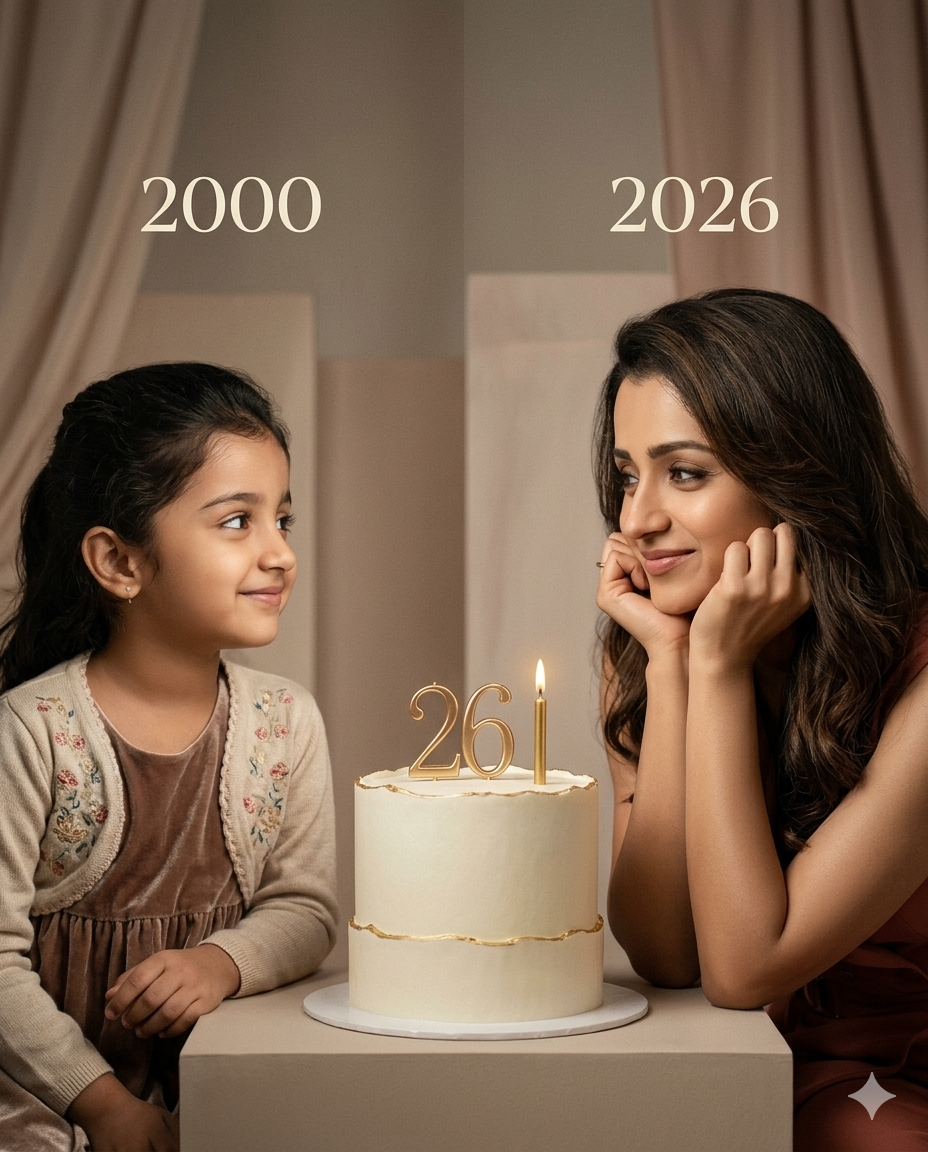 a recent photo) sits with her hands under her chin and looks at the child with a calm smile, with “2026” written above her.