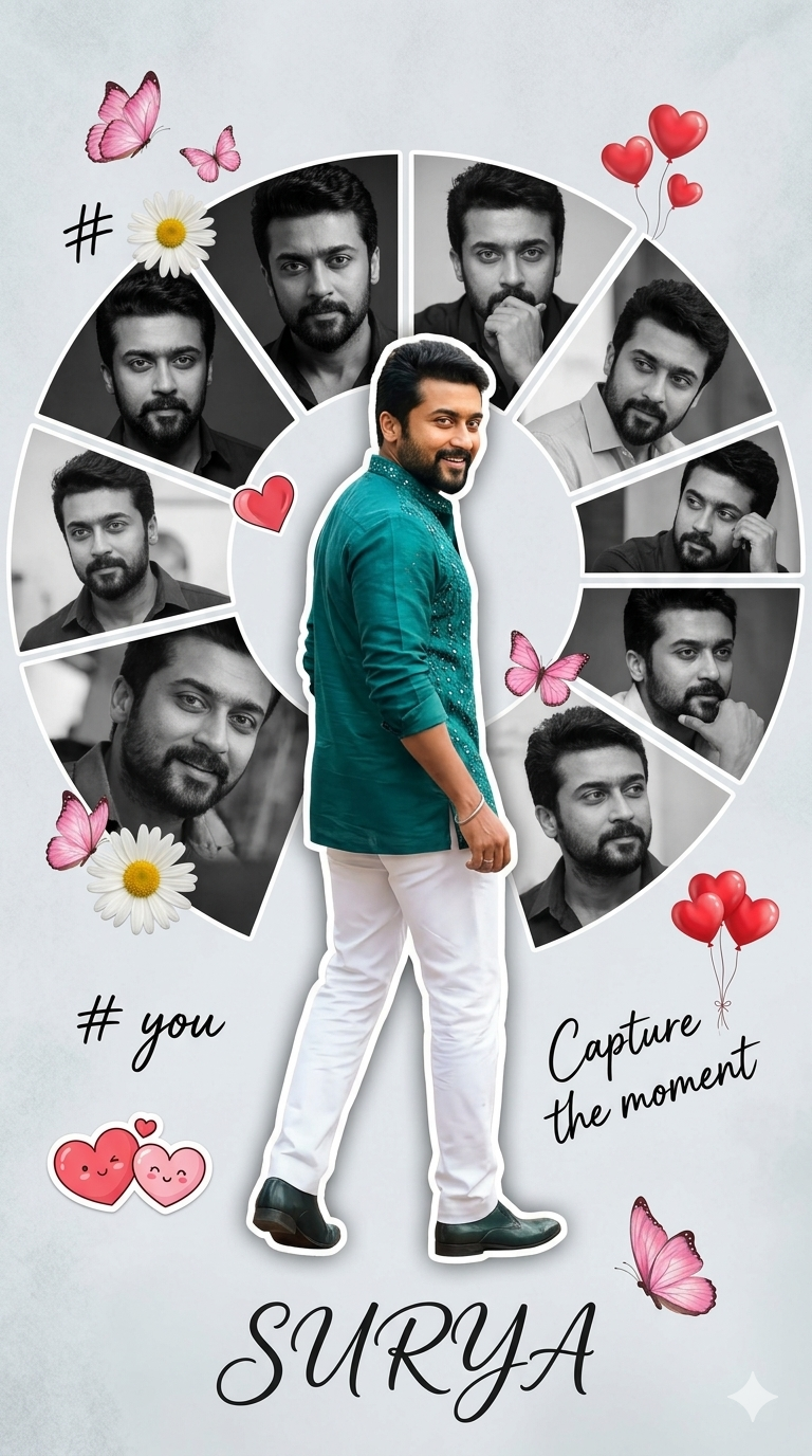 Decorative elements include pink butterflies, a floral daisy near the center, red heart balloons, and cute love-themed stickers. Handwritten-style text elements like “#,” “# you,” and “Capture the moment” are scattered around. A small heartbeat line with a heart icon is included. At the bottom, the name “SURYA” appears in elegant cursive typography. Soft shadows, smooth cutout blending, high-end Photoshop manipulation, romantic mood, pastel tones, high resolution, 4k. 9:16 ratio.