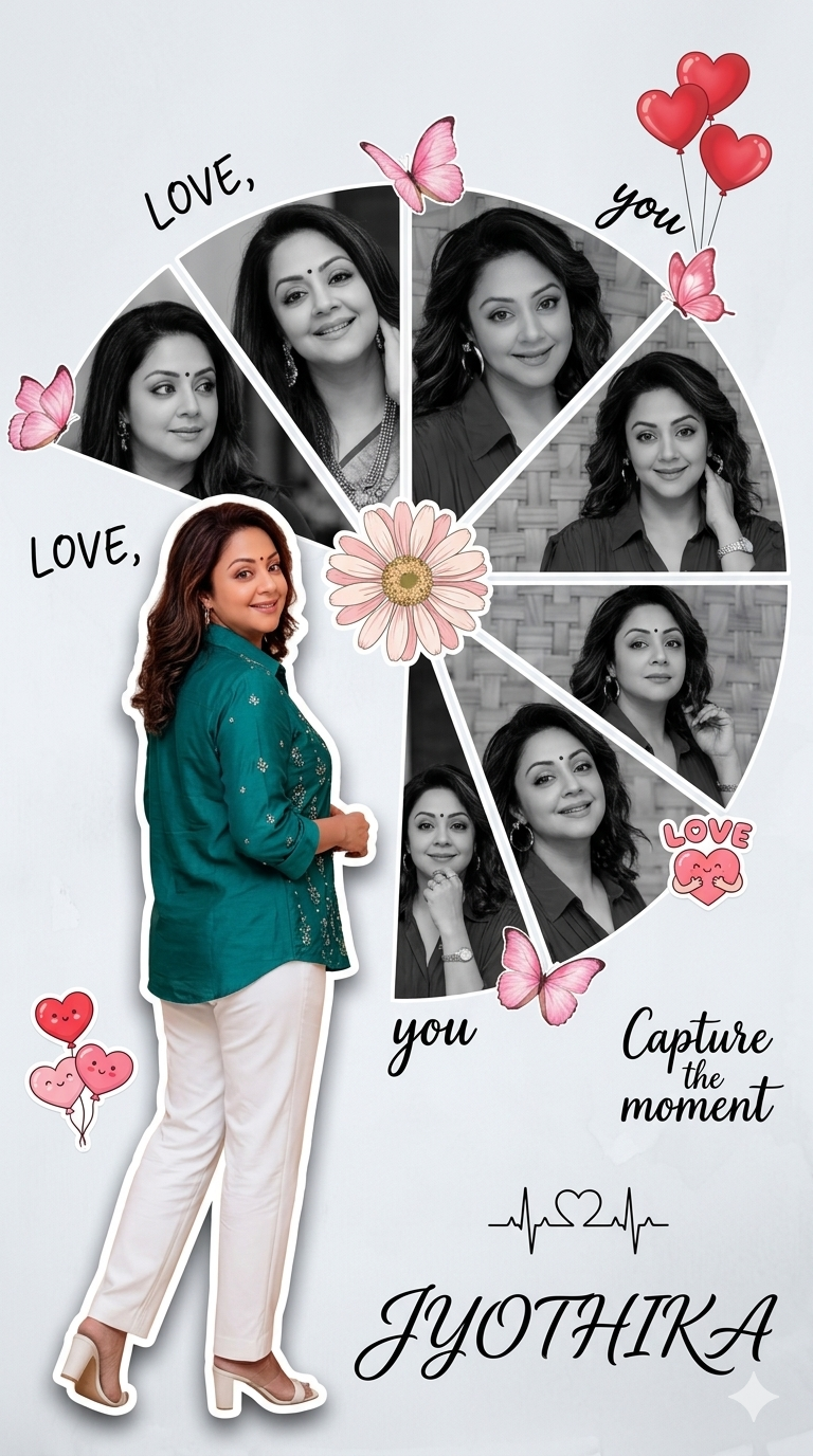 Decorative elements include pink butterflies, a floral daisy near the center, red heart balloons, and cute love-themed stickers. Handwritten-style text elements like “LOVE,” “you,” and “Capture the moment” are scattered around. A small heartbeat line with a heart icon is also included. At the bottom, the name “JYOTHIKA ” appears in elegant cursive typography. Soft shadows, smooth cutout blending, high-end Photoshop manipulation, romantic mood, pastel tones, high resolution, 4K, 9:16 ratio.