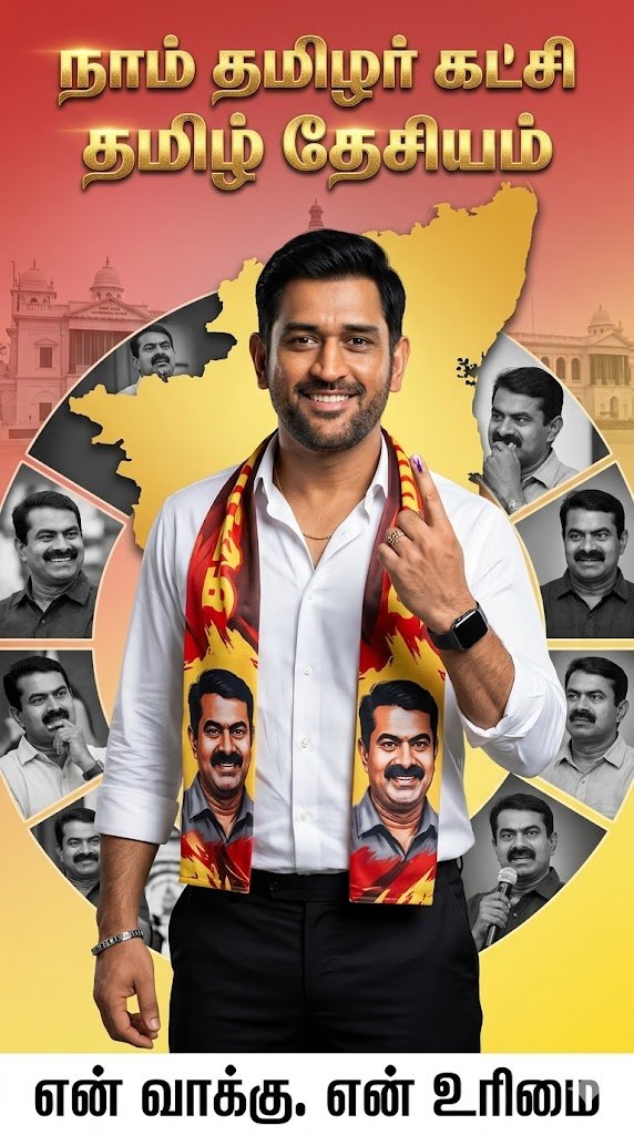 Create a 16K ultra-realistic cinematic portrait of a South Asian male/female using the uploaded image 1 as face reference. Face must be 100% identical (no changes). Pose: torso slightly turned (10-15°), Doking at the camera with confidence. Right hand raised, index finger pointing up with voting ink mark. Outfit: white shirt (open collar), black pants, The red tiger’s head symbol should be in the center. This symbol should feature a tiger’s head in natural colors surrounded by golden rays; often with the party’s name inscribed on it in Tamil, usually in white or gold. scarf seeman face add, gold chain, ring, black smartwatch (left), silver bracelet (right).
