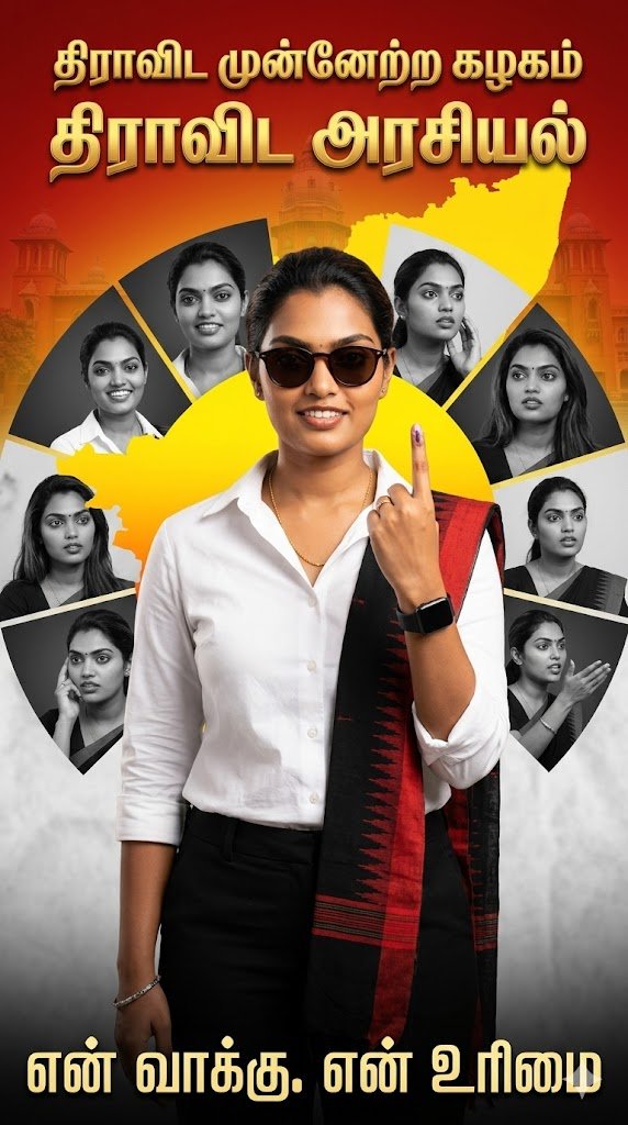 Background: red to yellow gradient, Tamil Nadu map inyellow, subtle government building illustration. Add top text in bold goldikes Tamil font: “திராவிட முன்னேற்ற கழகம்” & “திராவிட அரசியல் “.