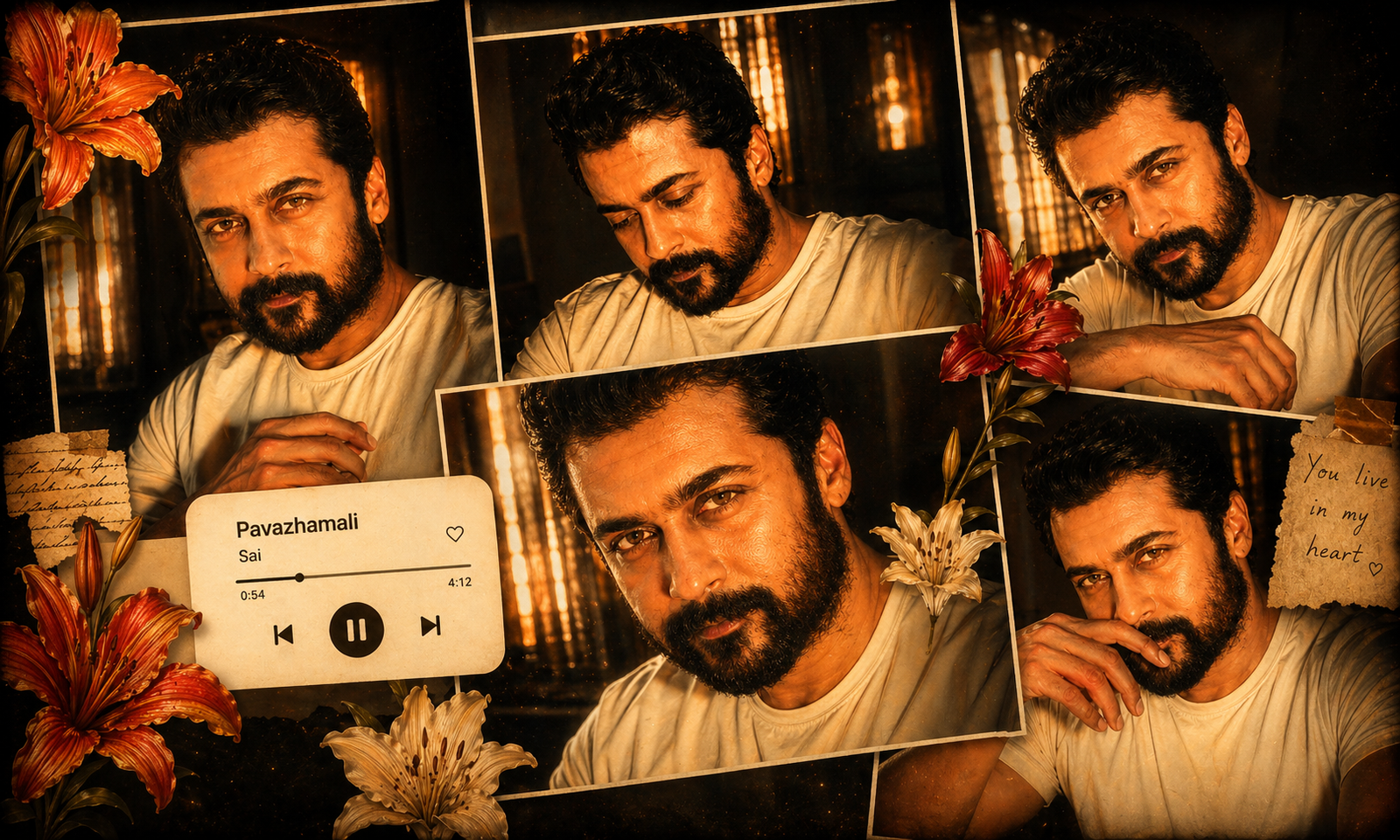 Ultra-realistic cinematic collage of a young men using the uploaded face exactly. The image is composed of multiple rectangular photo panels layered vertically and diagonally, creating 386 a scrapbook-style layout. Each panel shows close-up and mid-shot portraits of the same boy in a dim indoor room.Lighting: strong, warm, golden-orange direct flash lighting hitting the face from the front-left, creating high contrast, deep shadows and a glowing skin effect. Background remains dark with visible window curtains slightly illuminated. Harsh highlights on cheekbones, nose, and lips. Slight film grain and soft blur for a dreamy vintage feel. Color grading: intense amber, burnt orange, and golden tones dominating the entire image. High saturation, slightly crushed blacks, and glowing highlights.Overlay elements: Add realistic flower stickers (lilies in orange, cream, and red tones) placed around the collage. Add a music player Ul card in the center-left area with a soft rounded design. Include minimal playback bar and icons (play/pause, skip). Flash photography look, like taken on a digital camera at night Music player text: Title: “Pavazhamali” Artist: “Sai” Final touches; Slight glow/bloom effect on highlights Subtle vignette around edges Maintain natural skin texture, avoid over-smoothing Image size 9 :16