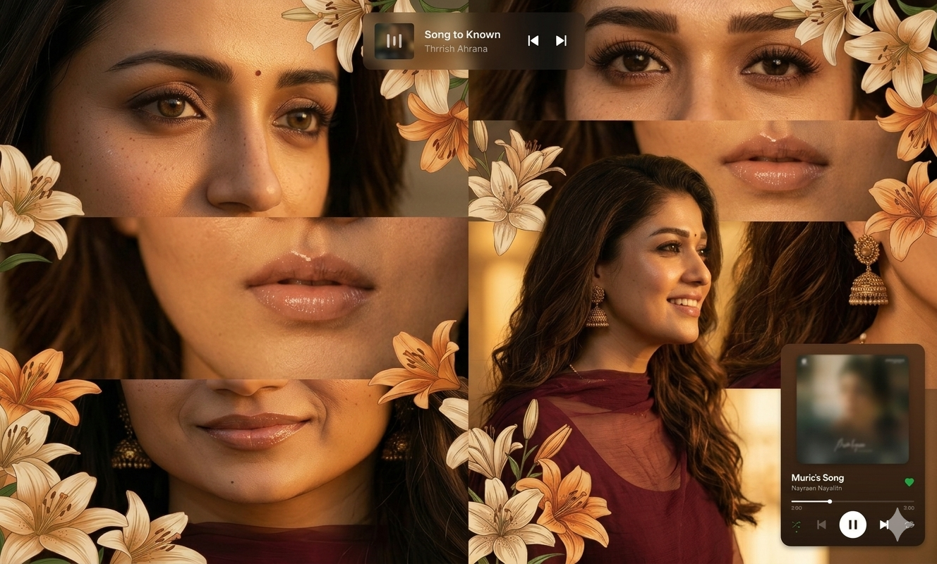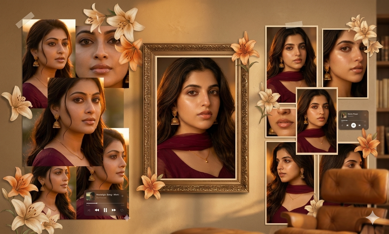 Warm-toned cinematic portrait collage of a young woman with soft glowing skin, subtle freckles, and glossy nude lips. She has long dark brown hair styled in loose waves with face-framing strands. She is wearing traditional gold jhumka earrings and a delicate necklace, dressed in a deep maroon outfit with a sheer dupatta around the neck. The lighting is golden-hour inspired with rich amber highlights and soft shadows, creating a cozy, intimate mood. The composition is a collage layout with multiple cropped frames of her face-close-ups of eyes, lips, and side profile-arranged aesthetically. Add soft floral elements like beige and orange lilies placed around the frame. Include a blurred music player overlay showing a song playing for a nostalgic vibe. Skin appears dewy and radiant, with minimal elegant makeup. Style: soft glam, editorial, aesthetic Instagram collage, warm color grading, high detail, shallow depth of field, cinematic lighting, 4K, ultra-realistic.size 9:16.