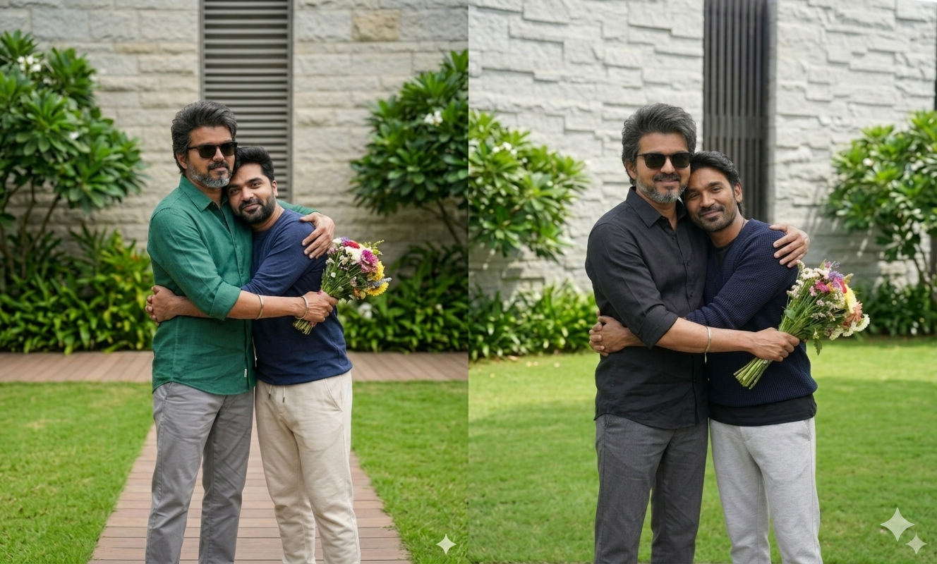 The bright, diffused natural daylight, likely from midday, illuminates the scene from slightly above and to the lett, creating soft shadows and natural highlights on the subjects and environment. The background features a striking modern building with a textured, light grey stone facade composed of irregularly shaped rectangular blocks, arranged horizontally. A narrow, dark vertical slatted architectural element is visible slightly to the right of the center in the background. ush, blurred green foliage (suggesting trees or bushes) frames the scene on the far left and right. The immediate foreground is a vibrant, neatly mown green grass lawn, with a section of wooden deck pathway visible at the bottom edge, running horizontally across the frame. The overall ambiance is joyful and affectionate.The central subjects are two South Asian men” positioned in a warm embrace. The man on the left, an” Thalapathey Vijay in his late 40s to early 50s, possesses a muscular and toned frame, displaying a balanced and masculine physique. His skin tone is medium olive with warm undertones. He has neatly styled, wavy dark brown hair with distinct grey streaks, particularly visible at the temples and sides, contributing to a distinguished appearance. He sports a well-groomed full beard and mustache, which are also salt-and-pepper grey. His facial features include a prominent nose and a kind, approachable smile with closed lips, suggesting warmth and contentment. His eyes are obscured by black wayfarer style sunglasses.The South Asian on the right, a younger man in his 25 Year old.Face must match with the reference picture, exactly same EAGE MUST BE 1000% IDENTICAL TO THE REFERENCE IMAGE (no changes to facial features, jawline, skin texture, or identity: lis mussy quiff haircut, gentle smile.