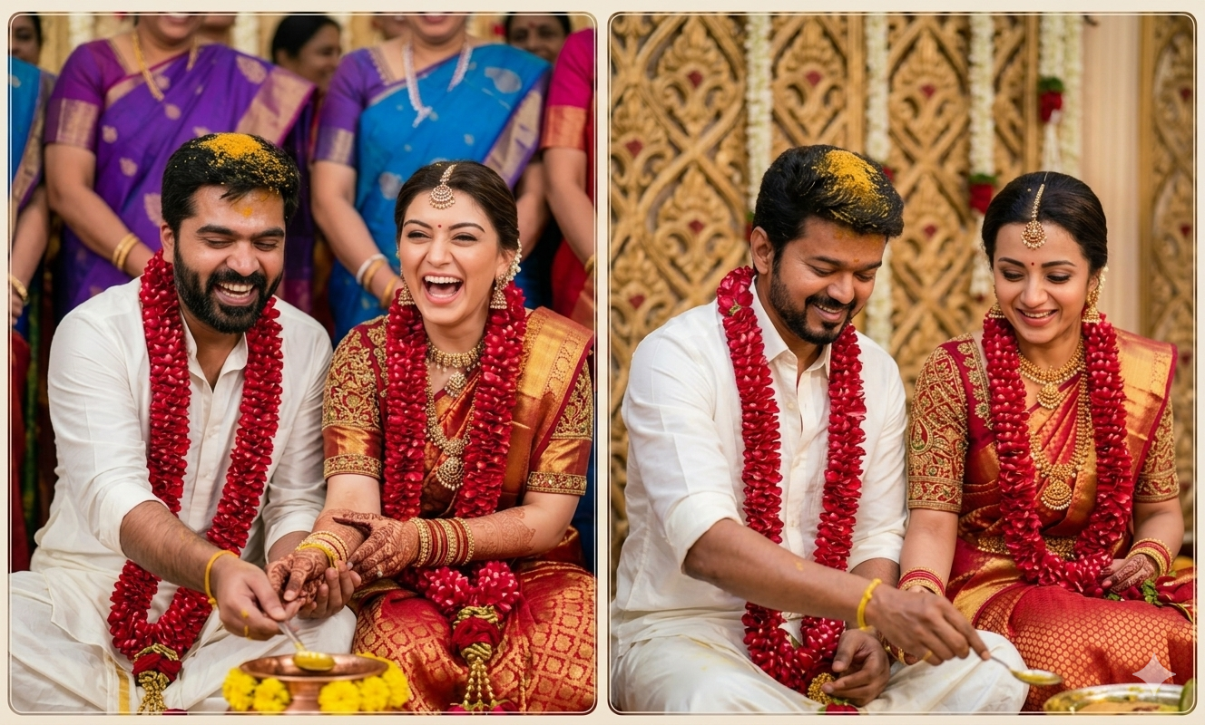 Ultra-realistic vertical shot, 9:16 aspect ratio. A candid, heartwarming South Indian Telugu wedding moment capturing a bride and groom bursting into genuine, uncontrollable laughter. The groom, wearing a simple white shirt and a thick red rose petal garland, has a beard and is smiling broadly with his eyes squinting in joy; he has a patch of yellow turmeric paste on the top of his head. The bride, sitting next to him, is laughing wholeheartedly with an open mouth, wearing a rich red and gold Kanjeevaram silk saree with intricate embroidery, heavy matching red rose garland. They are leaning forward engaging in a ritual.