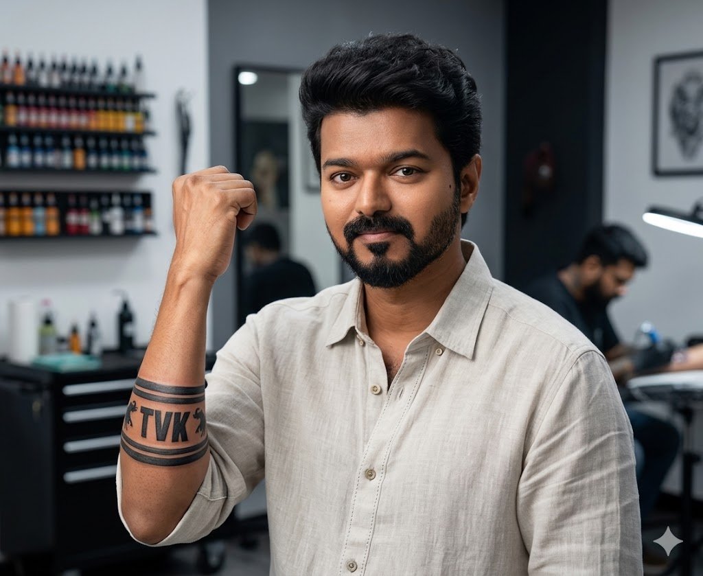 “Create a realistic photo of a human hand with a detailed TVK logo tattoo on the wrist. The tattoo should look naturally inked with proper skin texture, shadows, and depth. Use cinematic lighting with soft highlights and natural skin tone. The hand should be slightly tilted with a blurred background. High resolution, ultra-realistic, sharp details, and professional photography style.” This prompt works effectively because it clearly defines the subject, style, and quality expectations. You can modify it based on your personal preference or creative idea.